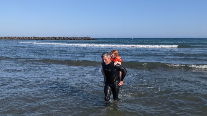 Finn hat sich noch nicht so richtig getraut mit dem Bodyboard in die Wellen zu gehen und war nur mit Sandra an der Hand in den Wellen. Amelie war dagegen richtig mutig und fand es total toll sich mit den Wellen auf dem Board treiben zu lassen. Zur Sicherheit hatte Amelie wieder die Schwimmweste an, obwohl sie überall stehen konnte. Markus und ich sind dagegen auf den SUPs die Wellen geritten und haben auch immer wieder ohne Paddel versucht im Stehen die Wellen zu reiten.