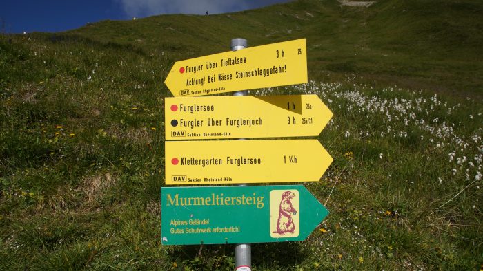 Nach einem kurzen Fußweg über einen breiten Schotterweg waren wir auch schon beim Einstieg in den Murmeltiersteig. Der Murmeltiersteig ist ein schöner Wanderpfad am Hang des Furglers, der uns mit nur leichtem Anstieg zum Furglersee (2.460 m) gebracht hat.