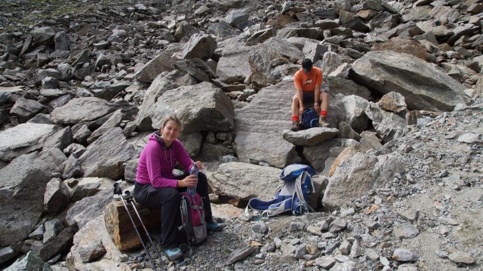Die letzten ca. 250 Höhenmeter hinauf zum Gipfel sollten die schwierigsten und interessantesten sein. Denn hier brauchte man nun immer wieder alle Viere. Nur teilweise gesichert führte nun ein Kletterpfad immer weiter hinauf und wir mussten immer wieder aufpassen, dass wir nicht den Weg verlieren. Das Klettern machte uns trotz der Anstrengung auf fast 3.000 m richtig viel Spaß.