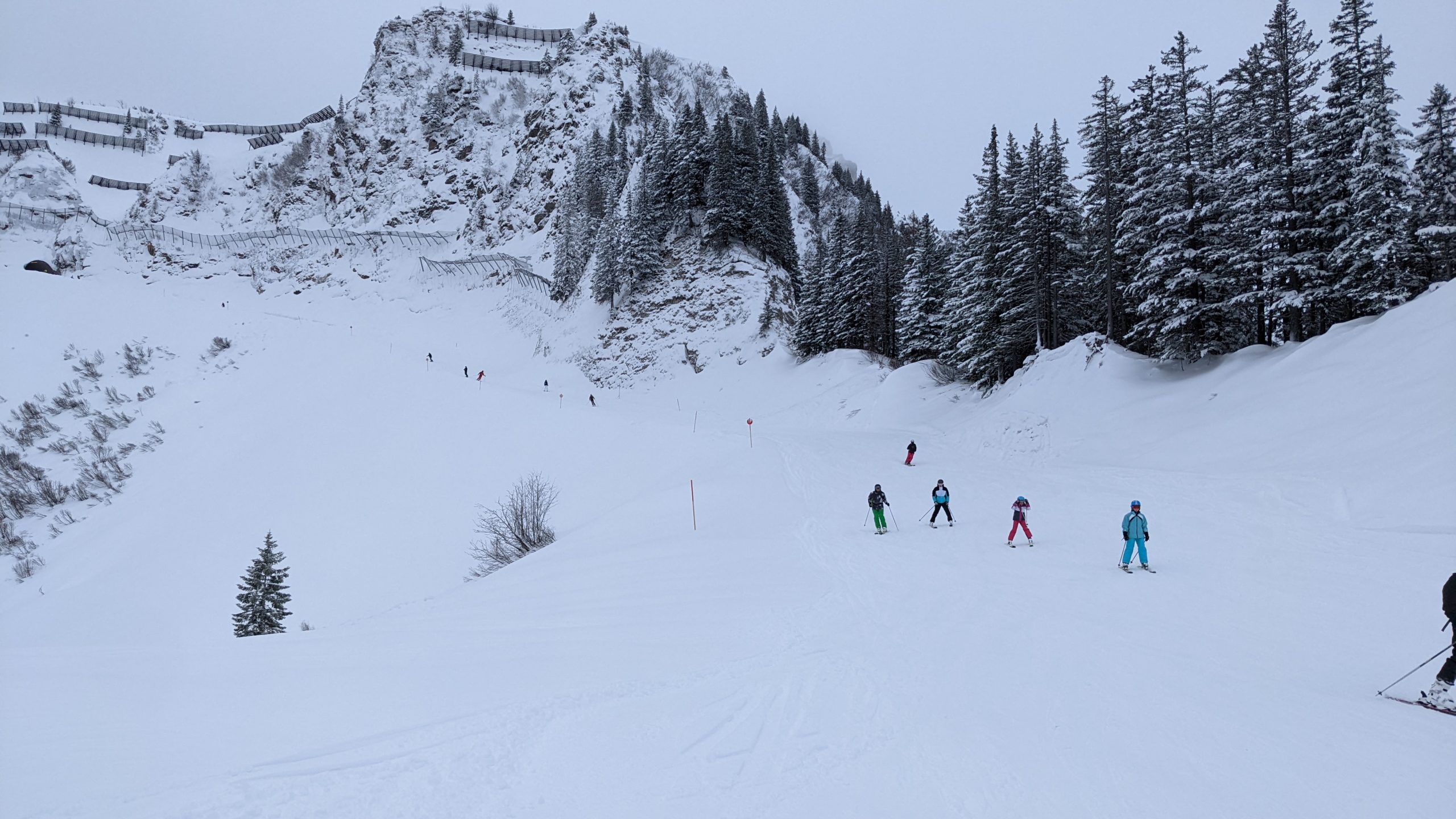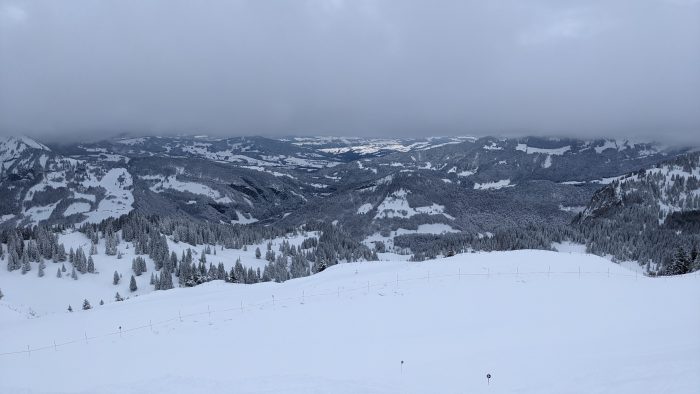 Heute waren wir Mittags von der Skischule unabhängig, da der Skikurs heute nach Damüls rüberfahren wollte und Amelie und Finn Essensmarken dabei hatten, damit sie zusammen mit dem Kurs Essen gehen konnten. Also sind wir dann heute mit den Zillys auch nach Damüls rübergefahren, da es dort noch mehr Pisten zur Auswahl gibt. Und die Pisten waren durch den Neuschnee wirklich toll und es schneite ja nach wie vor immer weiter.