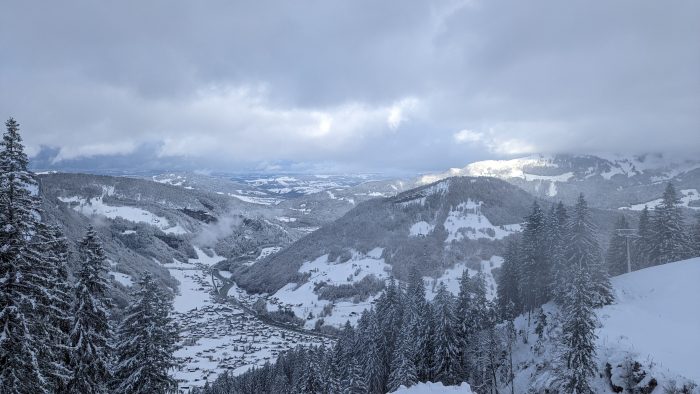 Mittlerweile hatte es aufgehört zu schneien und wir hatten vom Berghof einen fantastischen Blick ins berschneite Tal auf Mellau. Diesen Blick konnte ich aber nur kurz genießen, da ich die Zillys ja noch von der Gondel abholen musste. Zurück am Berghof haben Marcus und ich noch die Schneeketten auf Marcus Auto aufgezogen, damit wir Morgen wieder mit zwei Autos zur Gondel fahren können.
