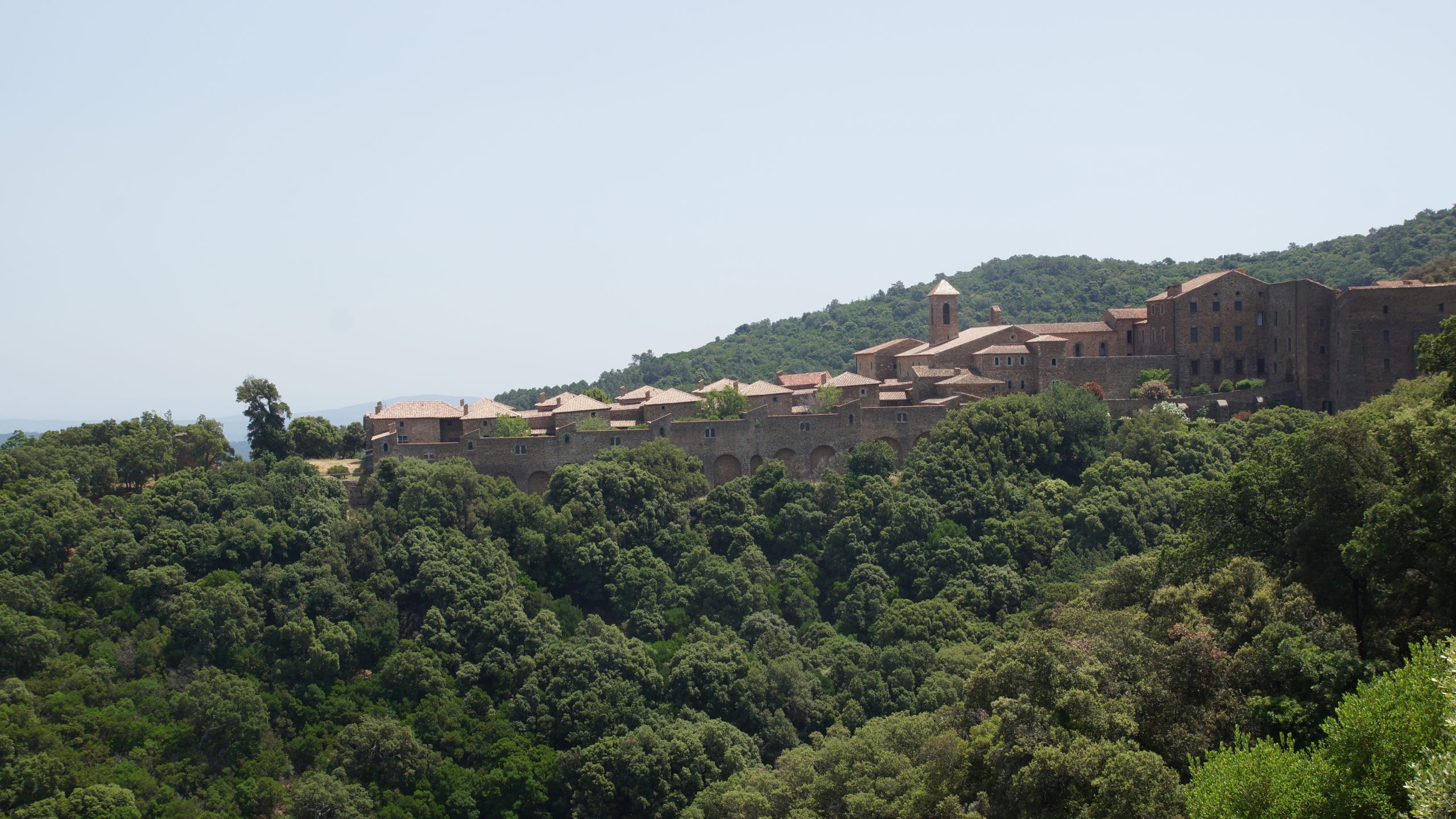 Zum Kartäuserkloster mussten wir mit dem Auto über wirklich sehr schmale Straßen über die Berge des Maurengebirges fahren. Das war schon sehr abenteuerlich, besonders wenn ein Auto entgegen kam. Das passte oft gar nicht, dann musste ein Auto rückwärts fahren bis genug Platz war, oder gerade so eben. Die Chatreuse de la Verne liegt in völliger Abgeschiedenheit mitten im Mauren-Massiv. Die Autos mussten wir auf einem vorgelagerten Parkplatz abstellen, um die letzten Meter zu Fuß zu gehen. Der Weg ermöglichte schöne Blicke auf die gesamte Klosteranlage, die mitten in der beeindruckenden Bergwelt liegt. Es mutet an wie eine Trutzburg, die imposant und massig aus den dichten, dunkelgrünen Wäldern emporragt.