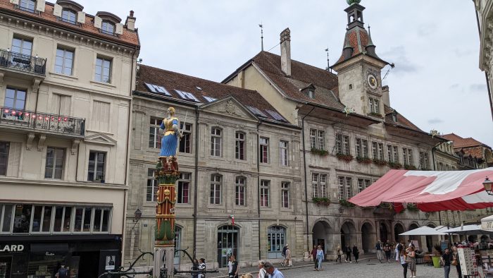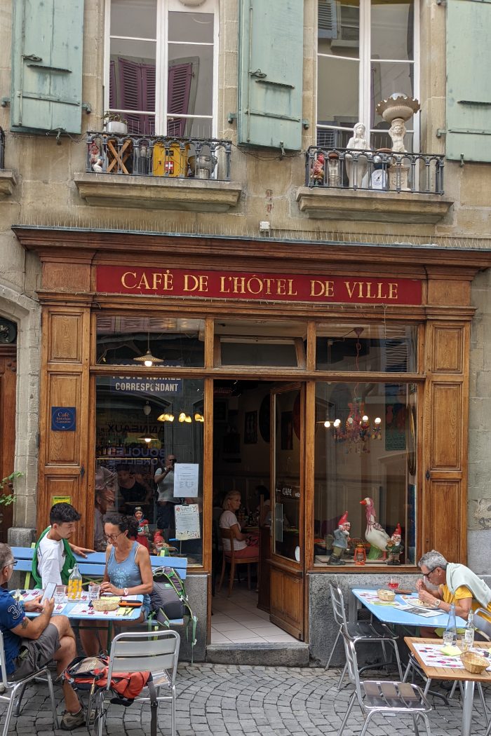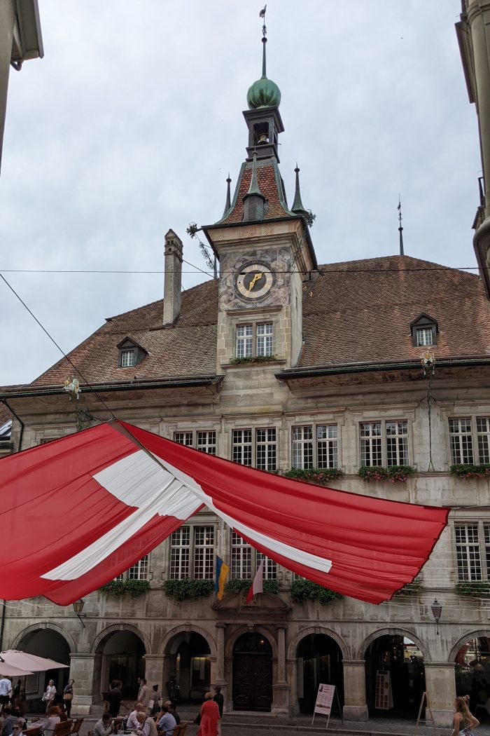 Finn wurde als erster am Place de la Palud schnell fündig und hat sich ein echtes Schweizer Taschenmesser gekauft. Der Place de la Palud ist der Hauptplatz in der Altstadt und hier steht auch das Hotel de Ville, welches mit einer riesigen Schweizer Flagge verziert war.