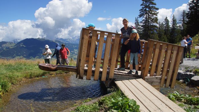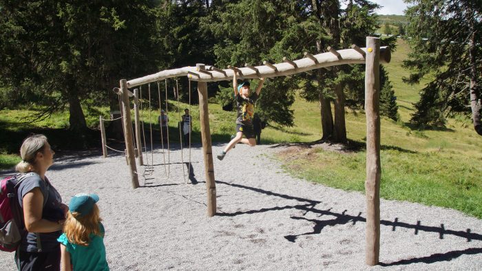Aber zunächst sind wir bis zur Bergstation gefahren, wo auch direkt der Forscherpfad begann. Der Pfad verlief am Golmberg langsam südlich von der Gondelbahn hinab zur Mittelstation. In kurzen Abständen gab es immer wieder Informationstafeln für die Kinder über z.B. die Vegetation oder die Tierwelt. Die Spielattraktionen waren dagegen eher für kleinere Kinder und wurden von Amelie und Finn als Babykram abgetan.