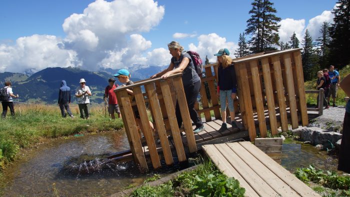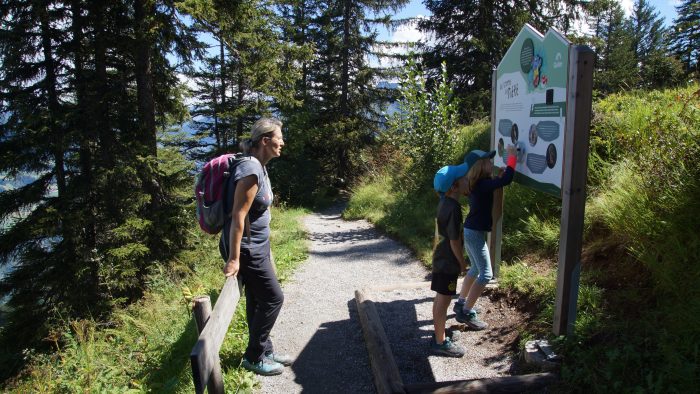 Den Pass konnten wir an allen Gondelstationen kaufen. Also sind wir zur nahe gelegenen Golmbergbahn gefahren, denn am Golmberg gibt es den Forscherpfad für Kinder, den wir wandern wollten. Die Pässe waren schnell gekauft und schon saßen wir alle in der Gondel hinauf auf den Golmberg. Auf der Gondelfahrt haben wir ganz viele Waldrutschen unterhalb der Gondel gesehen. Sofort stand für Amelie und Finn fest, das wir diese Rutschen auf dem Rückweg runterrutschen werden.