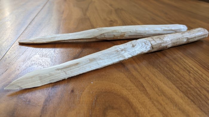 Zurück am Ferienhaus haben wir vor der Haustür am Fluss noch Stöcke zum Schnitzen gesucht. Die Kinder hatten sich gewünscht ein Holzmesser zu schnitzen. Nachdem wir passende Stöcke gefunden hatten, haben wir uns in den Garten gesetzt und haben tolle Messer geschnitzt.