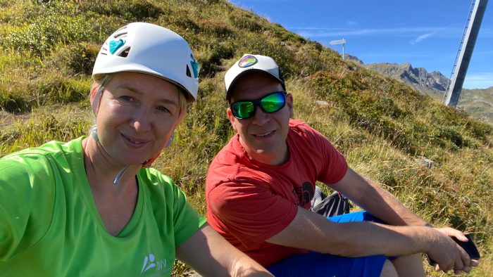 Kurz nach dem Ende des Klettersteigs, sind wir an der Familie vorbeigegangen, die vor uns den Steig geklettert war und da traute ich meinen Augen nicht. Der Vater, Norman, der Familie war nämlich ein ehemaliger Kollege von SAP Research, mit dem ich vor 11-13 Jahren zusammen in einer Forschungsgruppe bei SAP Research zusammengearbeitet habe und den ich seitdem nicht mehr gesehen hatte. Das war natürlich eine wirklich zufällige und lustige Begegnung und wir haben uns eine Weile unterhalten. Sandra und mich hat es natürlich sehr motiviert, dass Norman mit seiner Familie und seinen zwei Söhnen im Alter von 7 und 10 Jahren solche Klettersteige unternimmt. Aber seine Frau ist auch im DAV aktiv und hat sehr viel mehr Erfahrung als wir.