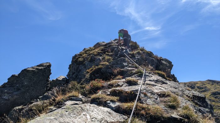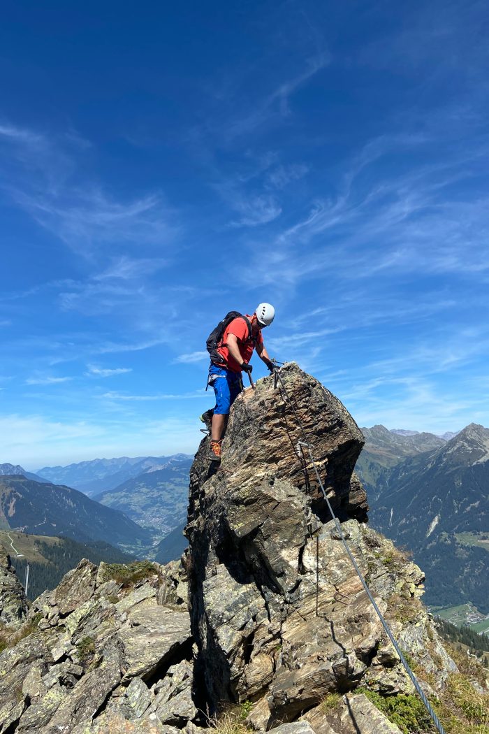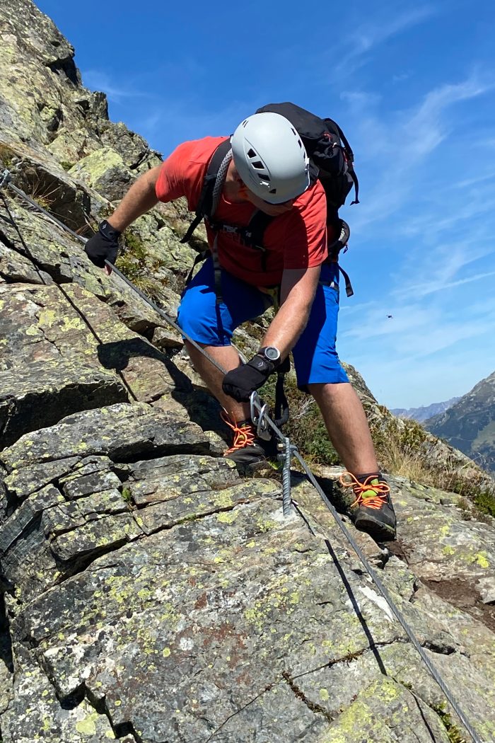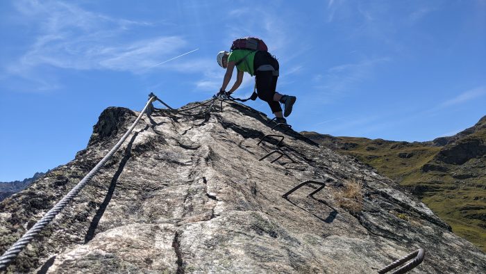 Dann ging es hinein in den Steig. Der Klettersteig ist mit einer Seillänge von ca. 200m ein relativ kurzer Steig und die Route über wenige Höhenmeter mit leichter Steigung am Grat entlang. Die Aussicht auf Heimspitze, Madrisella und Versettlaspitze sind überwältigend und in der zweiten Reihe thronen die 3.000er der Silvrettagruppe.