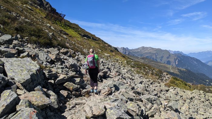 Von hier aus startete unser Aufstieg zum Einstieg des Klettersteigs Burg. Ca. 20 Minuten mussten wir direkt hinter der Bergstation steil hinauf laufen. Kurz vor dem Einstieg haben wir unsere Kletterausrüstung angelegt und kurz die tolle Aussicht genossen.
