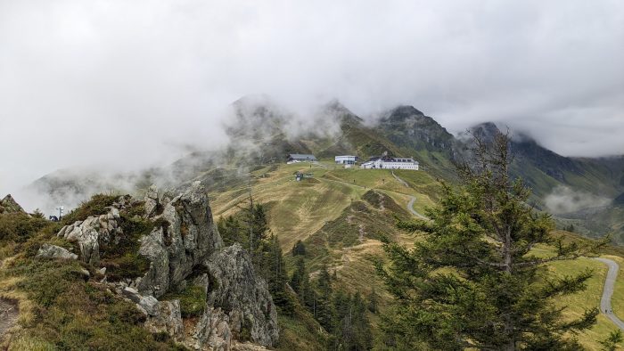 Den ganzen Tag wollen wir aber nun auch nicht im Haus verbringen. Also haben wir uns in die Autos gesetzt und sind das Tal hinauf nach Gaschurn gefahren. Wegen des schlechten Wetters war hier auch nicht viel los und dann saßen wir auch schon in der Gondel hinauf in das Silvretta Skigebiet. Hier wollten wir zusammen mit Oma und Opa etwas rumlaufen, solange es das Wetter zuließ. Markus wollte nicht mitkommen und stattdessen ins Schwimmbad gehen.