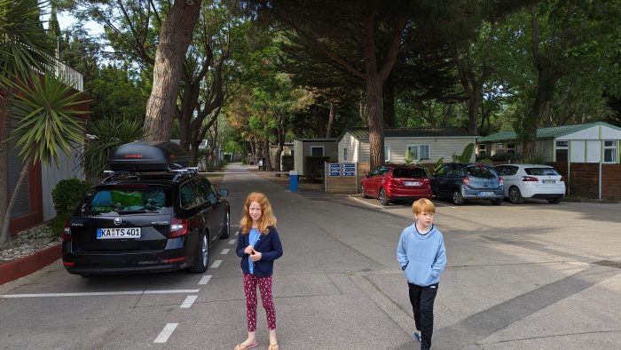 Die Fahrt war ziemlich anstrengend, da wir bei jeder Mautstation ca. 30 Minuten im Stau standen. Bis Lyon kamen wir aber ansonsten gut durch. Nach Lyon staute sich dann aber der Pfingstverkehr der Franzosen und der Urlaubsverkehr hauptsächlich aus den südlichen Bundesländern aus Deutschland enorm zusammen und wir kamen bis Avignon nur sehr zäh vorwärts. Letztendlich sind wir um 19 Uhr am Campingplatz angekommen. Die Kinder haben die 12 1/2 Stunden Fahrt wirklich sehr gut mitgemacht und wir waren alle glücklich endlich in unser Mobilehome zu kommen.