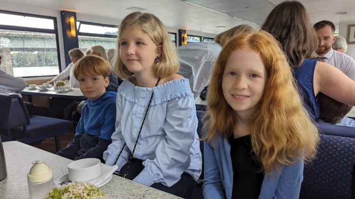 Gegen 15:30 Uhr sind wir planmäßig im Hotel Zweibrücker Hof in Herdecke an der Ruhr angekommen und nach dem Checkin saßen wir um 16:30 Uhr mit den anderen Gästen auf dem Boot, das extra für die Feiergesellschaft reserviert war. Auf dem Boot gab es Kaffee und Waffeln und es boten sich die ersten Gelegenheiten mit lange nicht gesehen Verwandten und Bekannten zu quatschen und zu klönen. Zum Glück hatte der Regen mittlerweile nachgelassen und die Sonne kam zur Feier des Tages sogar heraus und schob die Wolken beiseite.