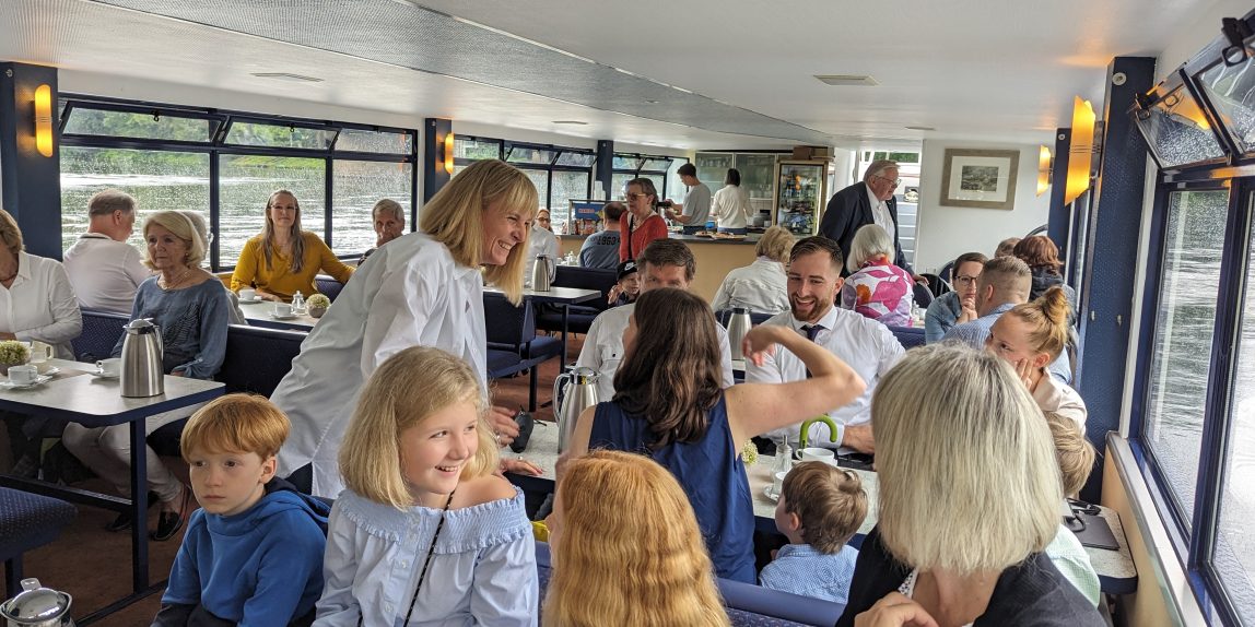 Gegen 15:30 Uhr sind wir planmäßig im Hotel Zweibrücker Hof in Herdecke an der Ruhr angekommen und nach dem Checkin saßen wir um 16:30 Uhr mit den anderen Gästen auf dem Boot, das extra für die Feiergesellschaft reserviert war. Auf dem Boot gab es Kaffee und Waffeln und es boten sich die ersten Gelegenheiten mit lange nicht gesehen Verwandten und Bekannten zu quatschen und zu klönen. Zum Glück hatte der Regen mittlerweile nachgelassen und die Sonne kam zur Feier des Tages sogar heraus und schob die Wolken beiseite.