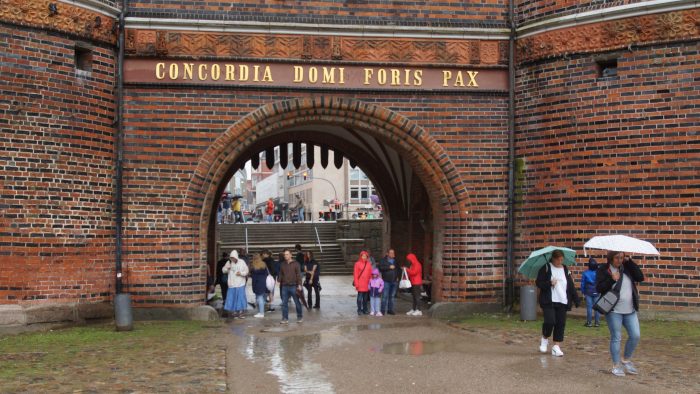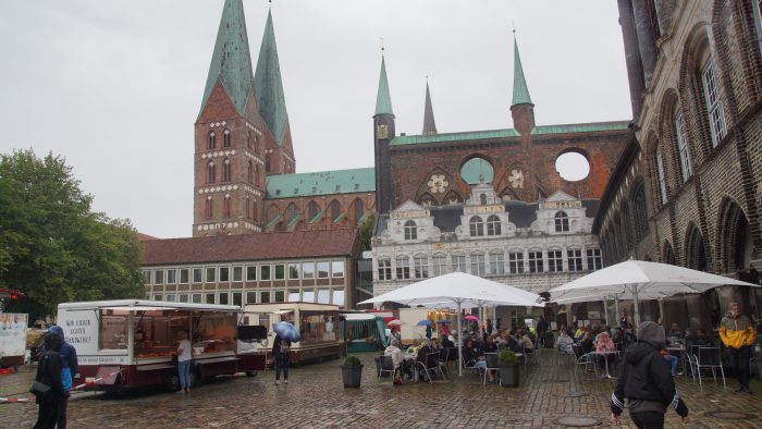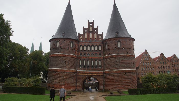 Zu Fuß sind wir dann durch den Regen Richtung Holsten Tor gelaufen. Nach ca. 20 Minuten waren standen wir vor den beeindruckend schiefen alten Türmen, die das Wahrzeichen Lübecks bildeten. Es regnete unaufhörlich, so dass wir keine große Lust verspürten gemütlich durch die Altstadt zu bummeln. Neben dem Rathaus, haben wir es uns daher in einem urigen Kaffee gemütlich gemacht auch um etwas zu trocknen.
