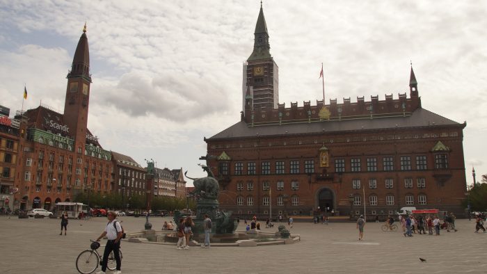 Läuft man aus dem Bahnhof raus, stolpert man quasi direkt vor den Tivoli. Das ist ein großer Vergnügungspark mit allerlei Fahrgeschäften. Der zog uns allerdings nicht weiter an, weswegen wir als erstes zum Rathausplatz gelaufen sind zum Københavns Rådhus. Der Rathausplatz ist ein großzügiger Platz mit einem Brunnen. Das Hauptgebäude ist natürlich das alte Rathaus – Københavns Rådhus, ein mächtiges Bauwerk mit einem der für Kopenhagen typischen grünen Türmchen. Auf der nordöstlichen Seite erstreckt sich das Einkaufzentrum der Stadt. Hier stehen auch teilweise alte Gebäude mit markanten Türmchen, in denen sich teilweise Hotels und Läden befinden. Auf der gegenüberliegenden südwestlichen Seite des Platzes steht ein großes, modernes neues Einkaufscenter in Form eines Glaskomplexes. Alte Bauweise trifft hier auf dem Platz auf die neue Moderne.