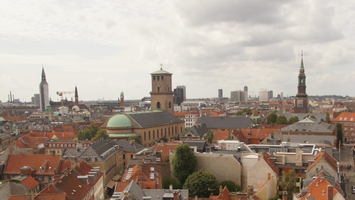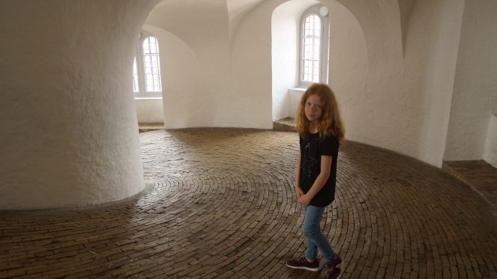 Weiter ging es für uns nun Richtung Nordosten in das Zentrum der Stadt. Das nächste Ziel war der Rundetårn – der runde Turm mitten im Stadtzentrum. Auf dem Weg dorthin sind wir noch gemütlich durch ein paar Souvenirshops geschlendert. Der Rundetårn ist heute eine bekannte Touristenattraktion, Observatorium, Ausstellungsort, und sein Dach ein vielbesuchter Aussichtspunkt, von dem man einen tollen Ausblick rund um die Altstadt und auf Kopenhagen hat. Das wollten wir uns natürlich nicht entgehen lassen. Das Besondere an dem Turm ist, dass er abgesehen von den letzten Metern vom Aussichtsbereich zum Observatorium, nicht über Treppen, sondern über eine spiralförmige Rampe bestiegen wird, die sich um die Turmmitte windet. Die letzten Meter zum Dach zur Aussichtsplattform, mussten wir dann doch noch ein paar Treppen laufen, bevor wir einen fantastischen Blick auf Kopenhagen genießen konnten. Auch unser nächstes Ziel, das Schloss Rosenborg, konnten wir schon von hier oben gut sehen.