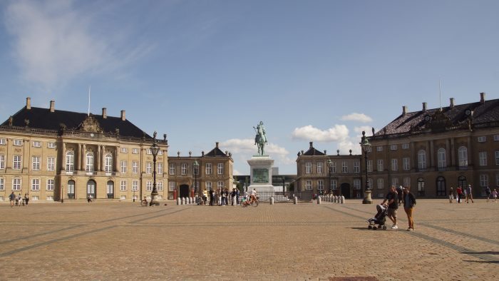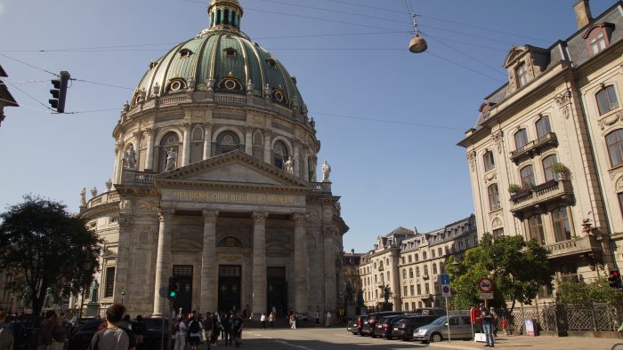 Unser nächstes Ziel Schloss Amalienborg lag direkt um die Ecke. Schloss Amalienborg ist die Kopenhagener Stadtresidenz der dänischen Königin Margrethe II. Das Schlossensemble wird durch vier einzelne Palais um einen achteckigen Platz gebildet. In sichtnähe von diesem achteckigen Platz befindet sich die Frederiks Kirke – Frederikskirche mit ihrer monumentalen Kuppel, die wir uns auch noch schnell angeschaut haben. Die Kirche beeindruckt durch ihre tollen Deckengemälde.