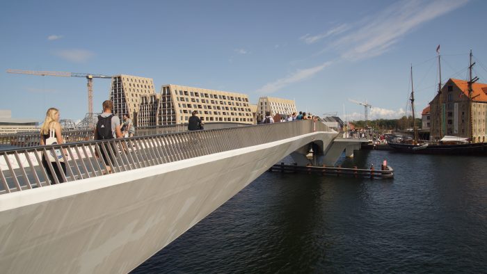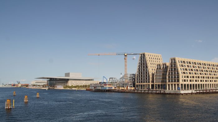 Langsam aber sicher wurden unsere Beine vom vielen Laufen müde und so beschlossen wir gemütlich am Wasser des Kopenhagener Hafens zurück Richtung Bahnhof zu laufen. Dort kamen wir zuerst an der berühmten Fahrrad-Fußgänger-Brücke vorbei. Von der hatten wir einen schönen Blick auf das gegenüberliegende moderne Opernhaus. Gemütlich ging es für uns nun am südwestlichen Kai entlang. Immer wieder konnten wir beobachten wie die Kopenhagener das schöne Wetter an den schön angelegten Wasserstegen nutzen.
