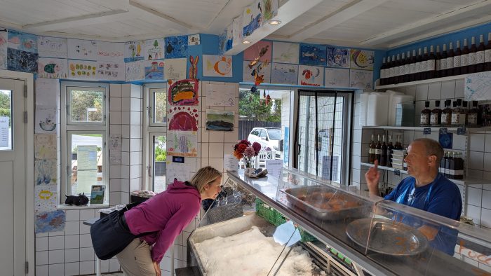 Der Halt bei dem Fischladen Den Friske Fisk auf dem Rückweg durfte nicht fehlen. Der Laden ist wirklich super und die Bedienung total freundlich und hilfsbereit. Viel Auswahl gab es zwar nicht mehr, trotzdem deckten wir uns mit frischem Lachs, Fischfrikadellen und einigen Salaten ein.