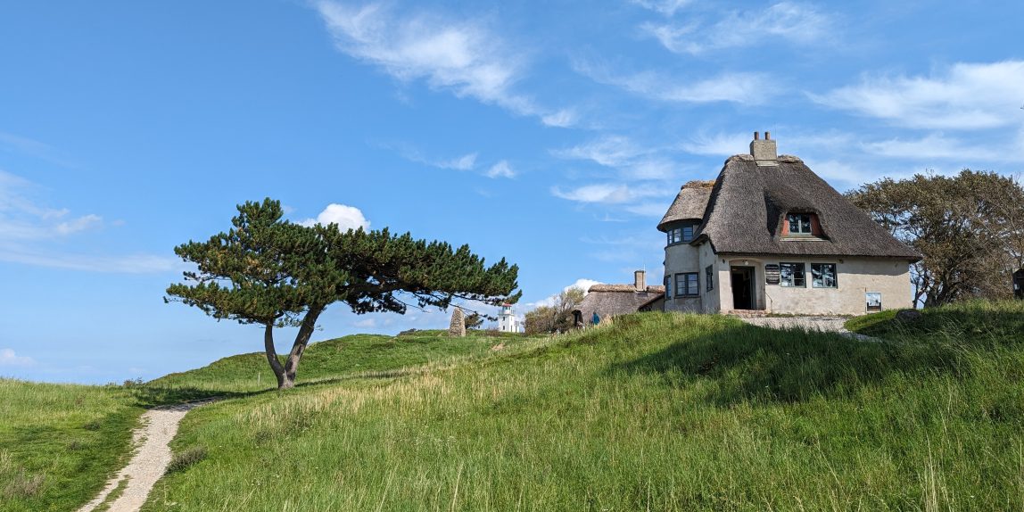 Das Haus liegt mitten auf einem großen Naturgrundstück mit Blick über das Kattegatt am nördlichen Ende von Hundested in Sichtweite zum kleinen Spodsbjerg Leuchtturm. Heute war klare Sicht und wir konnten bis zur kleinen Insel Hesselø sehen, die etwa 25 km entfernt liegt. Da die Sonne gerade so prächtig schien, entschieden wir uns zunächst einen kleinen Spaziergang zum Leuchtturm und durch die grandiose Landschaft an den Dünen entlang zu machen. Besonders die vom Wind gezeichneten Bäume sahen sehr lustig aus. Dank der tollen Sicht konnten wir vom Leuchtturm sehr weit die Nordküste von Seeland Richtung Nordosten blicken.