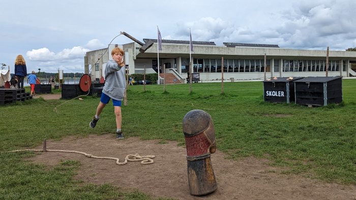 Außerdem baut das Museum die Wikingerschiffe nach und zwar mit denselben Werkzeugen und nach dem selben Verfahren wie es die Wikinger früher gemacht haben. Auf diesen nachgebauten Schiffen, die in einem kleinen Hafen des Museum stehen, kann man auch eine kleine Ausfahrt auf den Fjord unternehmen. Neben den richtigen Werkstätten, in denen man die Tischler dabei beobachten kann, wie sie die Schiffe nachbauen, können die Kinder auch selber an eine Werkbank und sich selber ein kleines Wikingerschiff bauen. Das hatte sich Finn natürlich nicht zweimal sagen lassen. Amelie wollte lieber die Tischler in den Werkstätten beobachten.