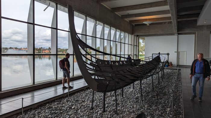 Für die zweite Zeitreise am heutigen Tag ging es an den Hafen von Roskilde am Roskilde Fjord zu dem Wikinger Museum. Besser gesagt zu dem Wikingerschiffsmuseum. Denn hier im Roskilde Fjord wurden 1962 fünf Wikingerschiffe ausgegraben, die aus dem Jahr 1070 n. Chr. stammen. Die ausgegrabenen Schiffe wurden damals von den Wikingern zum Schutz und zur Kontrolle der Hauptfahrrine des Fjordes vor feindlichen Angriffen versenkt. Roskilde selbst war danach nur noch über eine tiefe, mäandernde Nebenfahrrinne zu erreichen, die eine gute Ortskenntnis voraussetzte. Im Fall eines Angriffs über See hätte dies einen Angreifer viel Zeit und vor allem das Überraschungsmoment gekostet.