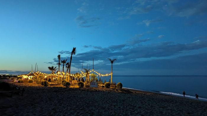 Zuerst haben wir schnell alles aus dem Auto ausgepackt und im Mobilehome verstaut, damit wir noch zum Einkaufen in den nahe gelegenen Supermarkt fahren konnten. Dann haben wir uns Spaghetti gekocht und den ersten Abend auf unserer Terrasse genossen. Zum Abschluss haben wir alle zusammen noch einen kleinen Abstecher zum Strand gemacht. Direkt an unserem Strandabschnitt befinden sich zwei Strandbars, die sehr verlockend aussehen und die wir mit Sicherheit beide testen werden, wenn alle Familien da sind.