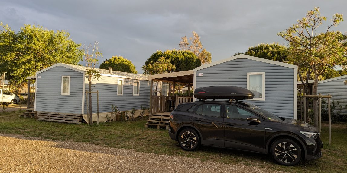 Um 3 Uhr nachts klingelte bereits unser Wecker. Bereits gestern hatten wir bei strömenden Regen die meisten Sachen ins Auto gepackt. Um ca. 4:30 Uhr saßen wir endlich alle im Auto und es ging los. Bis Lyon kamen wir auch gut durch. Dann fing wie jedes Jahr Pfingsten der Stau an. Insgesamt standen wir 2 Stunden im Stau, haben 2 Stunden an Ladesäulen verbracht und sind 10 Stunden effektiv gefahren, so dass wir nach ca. 14 Stunden an unserem Campingplatz angekommen sind.