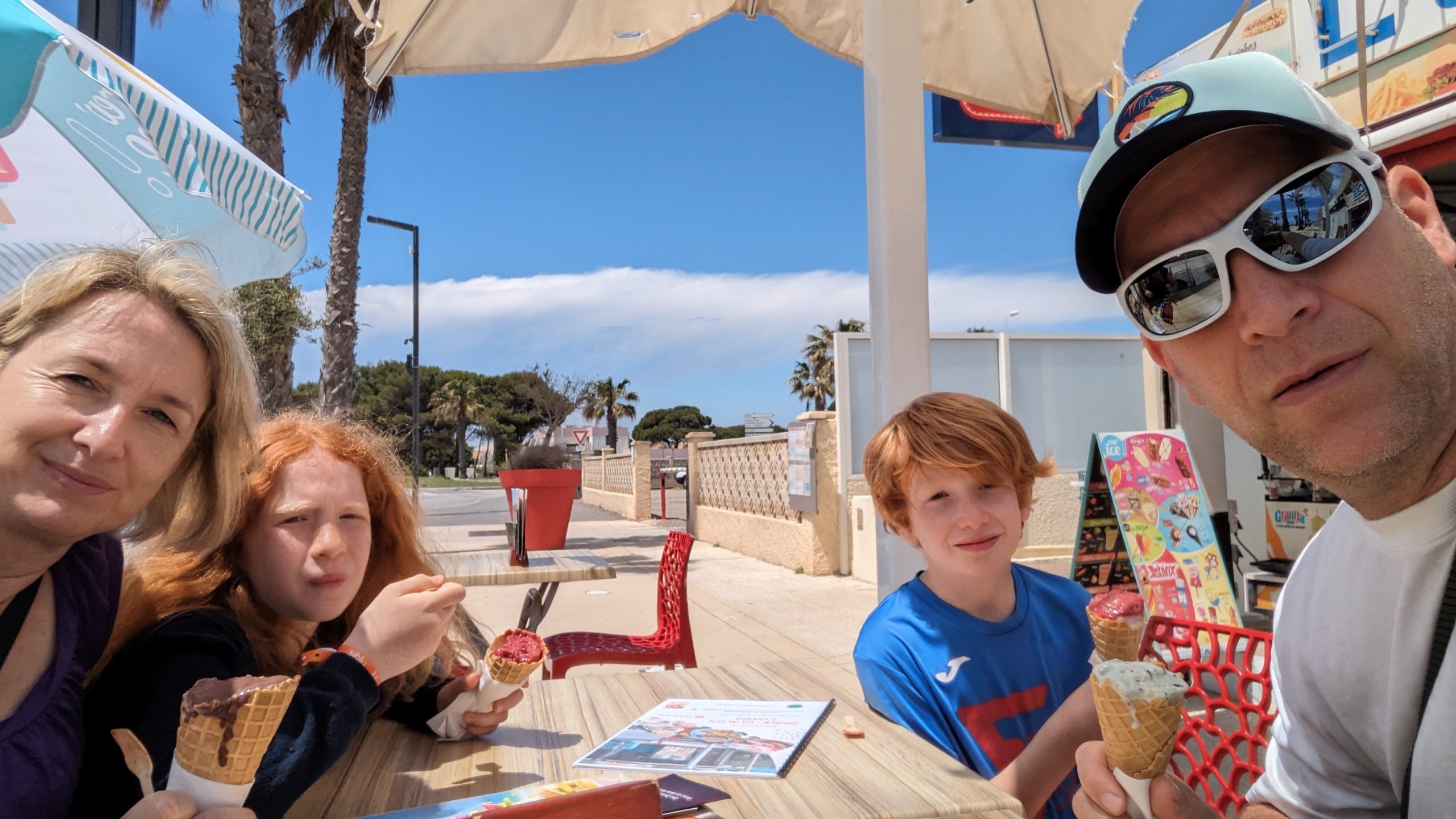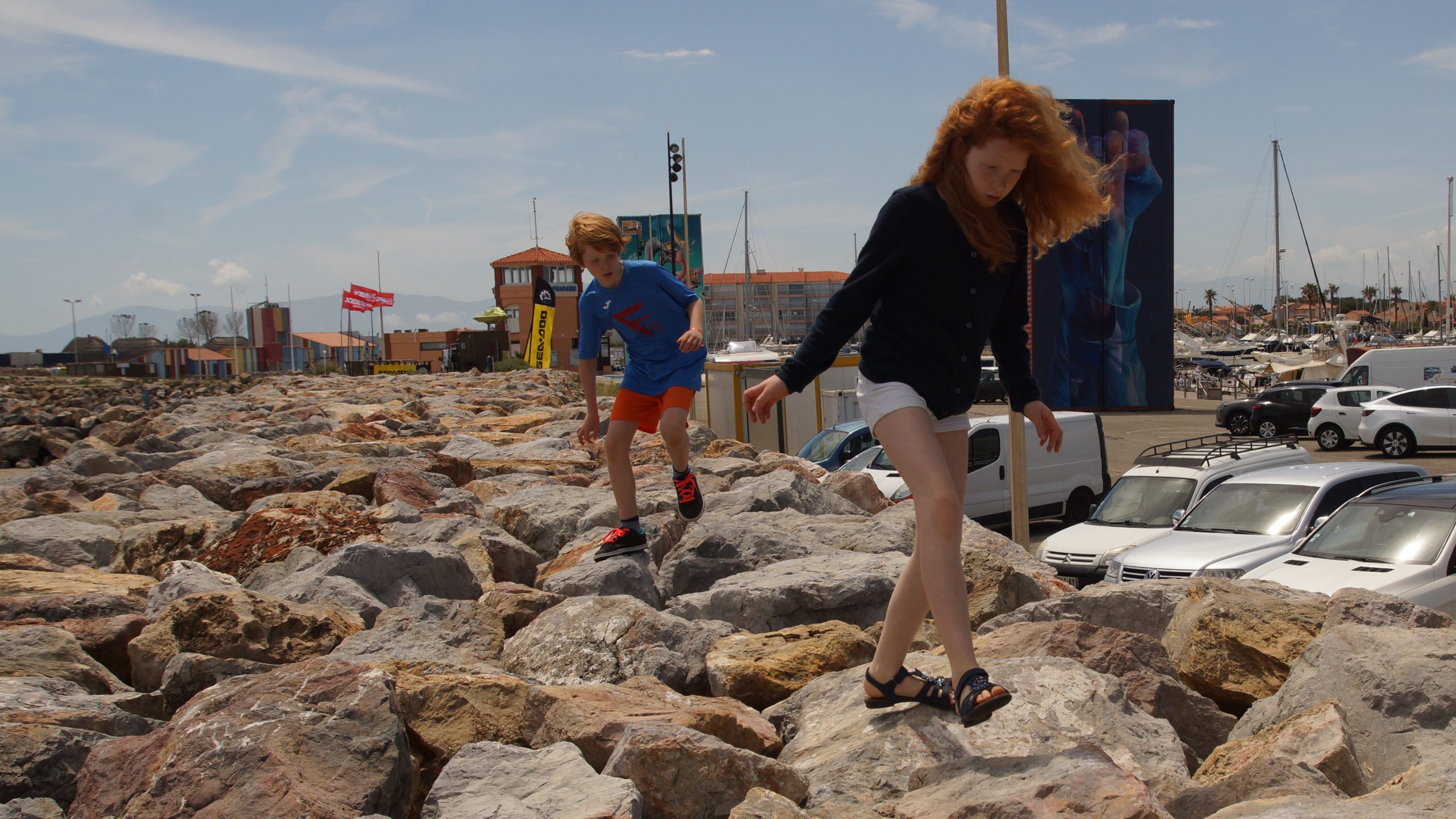 Am Hafenparkplatz standen lustige Kunstwerke, die aus alten Schiffcontainern gebaut wurden, die dann bemalt wurden. Nachdem wir auf den Schutzmauern aus aufgeschütteten Steinen rumgeklettert sind, gab es am Hafen für uns noch ein Eis zur Erfrischung. Das Eis ist wie immer in Frankreich unglaublich teuer. Geschmeckt hat es trotzdem.
