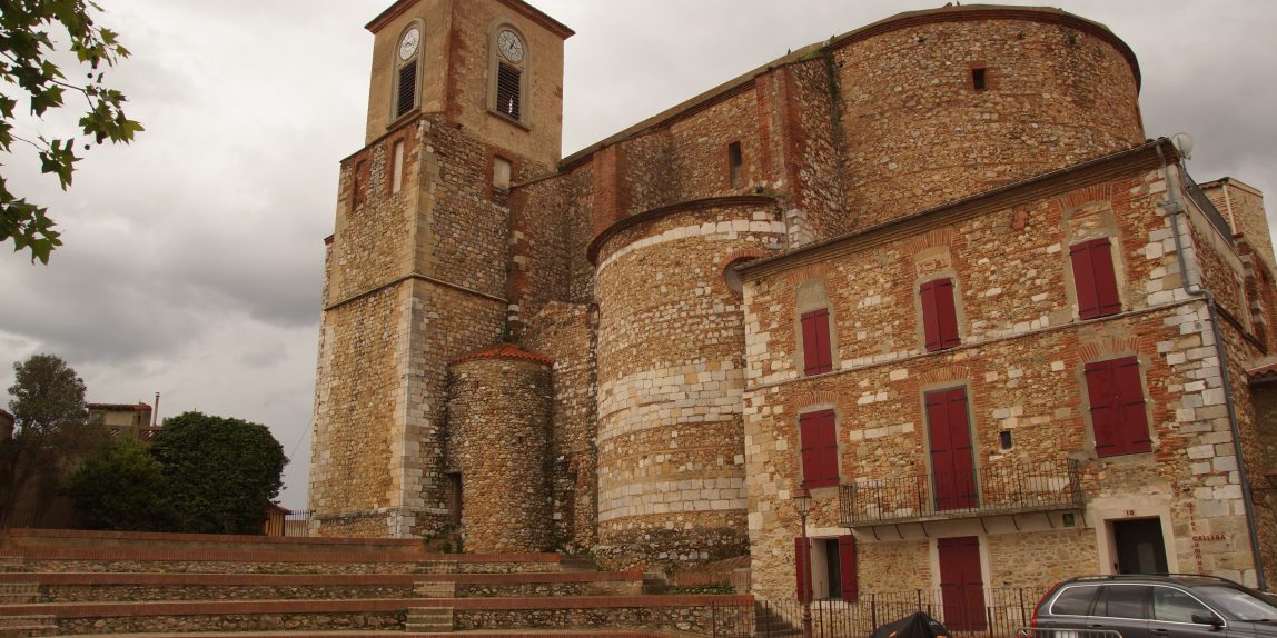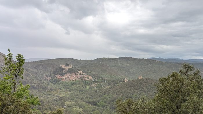 Nach dem Mittag sind wir dann zu unserem ersten Ausflug aufgebrochen. Heute sollte es nach Castelnou am Fuße der Pyrenäen gehen. Allerdings sahen wir bei der Fahrt im Auto bereits die dunklen Wolken immer bedrohlicher aufkommen. Kurz vor unserem Ziel fing es dann richtig zu regnen an, so dass wir kurzerhand unseren Ausflug umgeplant haben und nach Thuir gefahren sind. Hier hatten wir die Hoffnung auch im Regen irgendwo ein Eis essen zu können. Vorher konnten wir aber noch von einem Parkplatz einen Blick auf den schönen Ort Castelnou werfen.