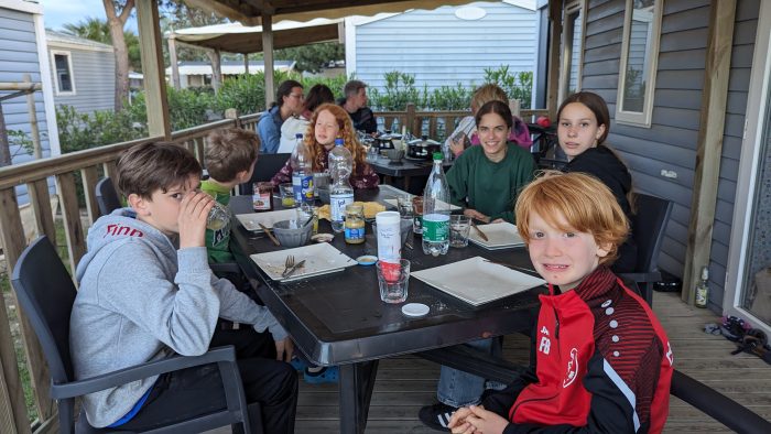 Gegen Abend wurde es dann hektisch, denn die Farkes waren im Anmarsch. Nach der 10 stündigen Anreise wollten wir sie direkt mit einem leckeren Essen verwöhnen. Während die Zillys ein hervorragendes Chilli con Carne gekocht haben, haben Mila und Amelie für die Kinder einen Haufen Crepes gebacken. Wir alle haben uns sehr gefreut, als die Farkes dann auch endlich angekommen waren und wir den Abend zusammen genießen konnten.