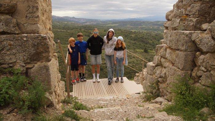 Die Besichtigung der Burg war auch sehr schön und von der Burg konnten wir immer wieder schöne Blicke auf die hügelige umgebende Landschaft werfen. Im ganzen Dorf und auch in der Burg lagen immer wieder alte Katapultkugeln, die früher bei Belagerungen des Dorfes benutzt wurden, herum – z.B. zur Zierde der Gartenmauern.