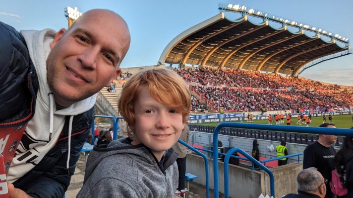 Nachdem der Regen etwas nachgelassen hatte, sind wir mit den Zillys und Charlotta zum Einkaufszentrum in Claira gefahren. Während die Frauen mit den Mädchen die Klamottenläden unsicher gemacht haben, sind Markus und ich mit den Jungs in den Carrefour zum Lebensmitteleinkaufen gegangen. Ich bin in den französischen Einkaufsläden immer wieder begeistert von den großen Fischtheken. Die Klamottenjäger waren zum Glück auch erfolgreich und nach einem leckeren Abendessen mit Spaghetti mit Crevettes und Lachs, saßen Finn, Jan, Markus und ich im Auto mit dem Ziel Stade Raoul Barrière in Béziers.