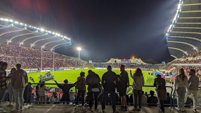 Auf uns wartete ein wirklich spannendes Spiel mit vielen Feldtoren und einigen Versuchen, so dass immer wieder die Führung wechselte. Je länger das Spiel dauerte, desto mehr haben wir auch die Regeln einigermaßen nachvollziehen können. Die Stimmung kochte fast über als 2 Minuten vor Schluss die Heimmannschaft aus Béziers mit einem Versuch und damit 5 Punkten ausgleichen konnte. Nachdem auch der Sonderkick nach dem Versuch über die Stangen flog, führte AS Béziers mit gerade einmal zwei Punkten.