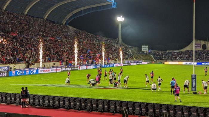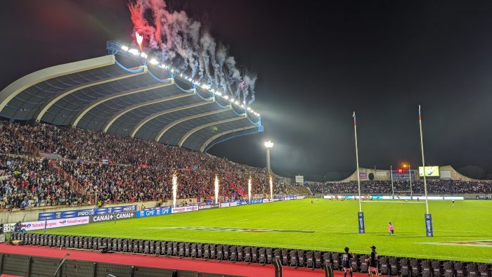 Dort spielte die Heimmannschaft aus Béziers im Viertelfinal des französischen Wettbewerbs Pro D2. gegen Brive. Die Fahrt dauerte etwas mehr als eine Stunde und schon weit vor dem Stadion strömten Menschenscharen ins Stadion. Rugby ist hier in Südfrankreich eine sehr beliebte Sportart. Mit etwas Glück konnten wir unser Auto ziemlich nahe am Stadion parken und saßen kurz darauf auch schon auf unseren Plätzen auf der Nordtribüne. Das Stadion fasst etwas mehr als 18 Tausend Zuschauer war so gut wie ausverkauft und wir waren mittendrin. Die Stimmung war ausgelassen und prächtig und mit ordentlichem Feuerwerk in den französischen Nationalfarben wurden die Mannschaften nach dem Aufwärmen im Stadion empfangen.