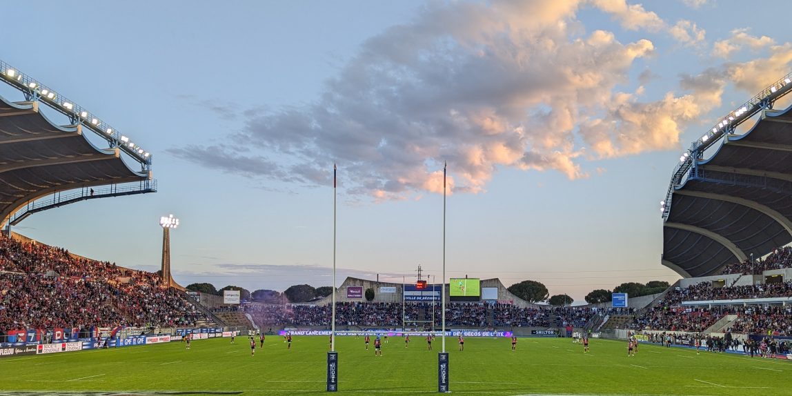 Dort spielte die Heimmannschaft aus Béziers im Viertelfinal des französischen Wettbewerbs Pro D2. gegen Brive. Die Fahrt dauerte etwas mehr als eine Stunde und schon weit vor dem Stadion strömten Menschenscharen ins Stadion. Rugby ist hier in Südfrankreich eine sehr beliebte Sportart. Mit etwas Glück konnten wir unser Auto ziemlich nahe am Stadion parken und saßen kurz darauf auch schon auf unseren Plätzen auf der Nordtribüne. Das Stadion fasst etwas mehr als 18 Tausend Zuschauer war so gut wie ausverkauft und wir waren mittendrin. Die Stimmung war ausgelassen und prächtig und mit ordentlichem Feuerwerk in den französischen Nationalfarben wurden die Mannschaften nach dem Aufwärmen im Stadion empfangen.