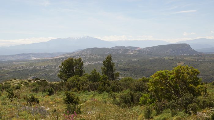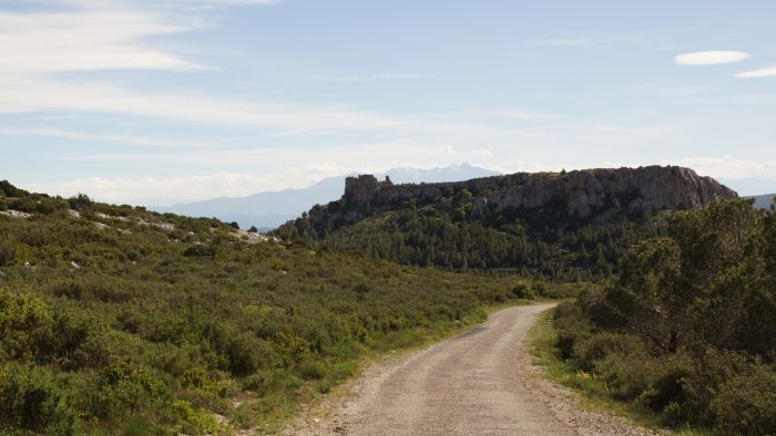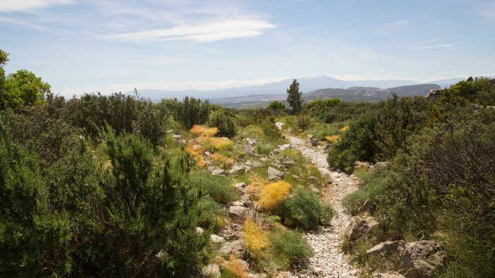 Von Périllos aus führte uns dann die alte Stichstraße, die wir teilweise etwas über kleine Wanderpfade abkürzen konnten, in ein Tal hinab. Auf einer kleinen Straße und kleinen Wanderpfaden kämpften wir uns dann noch einmal zum Col de la Sabina hinauf, von wo aus wir auch wieder den Tafelberg mit den Ruinen des Château d’Opoul und im Hintergrund den Canigou erblicken konnten.