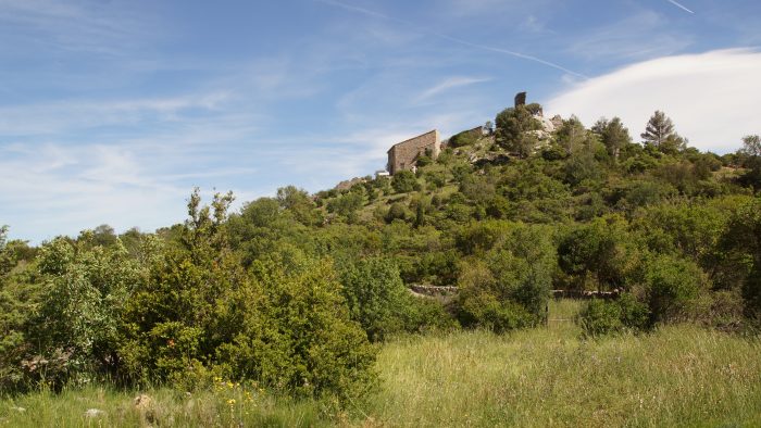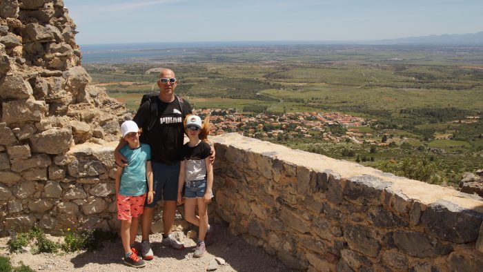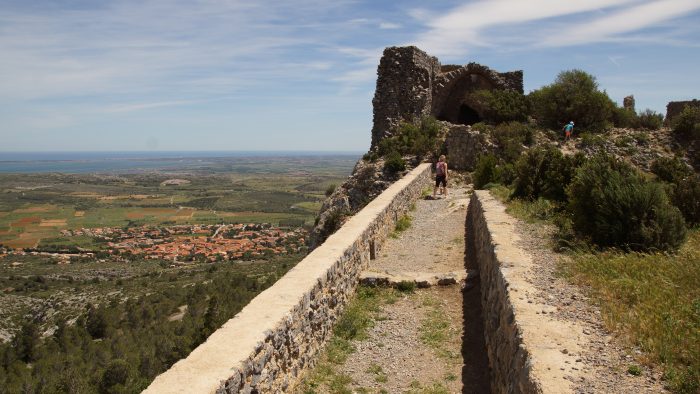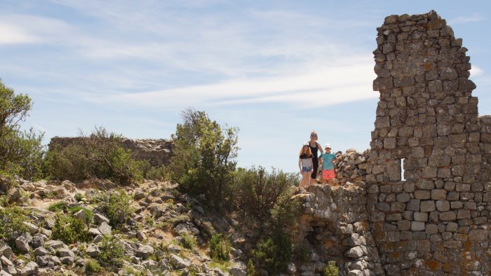 Vom Parkplatz aus ging der Weg zunächst kurz und knackig auf einem kleinen Pfad hinauf zu den Ruinen des Château d’Opoul. Von den Ruinen konnten wir einen fantastischen Blick auf das Dorf Opoul-Périllos an seinem Fuss, den Étang de Leucate am Mittelmeer werfen, auf dem die Kinder der Surferfamilien heute surfen waren, und auf den Canigou in den Pyrenäen genießen. Die Einsamkeit in den Ruinen nutzen wir für ein kleines Picknick.