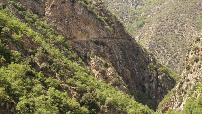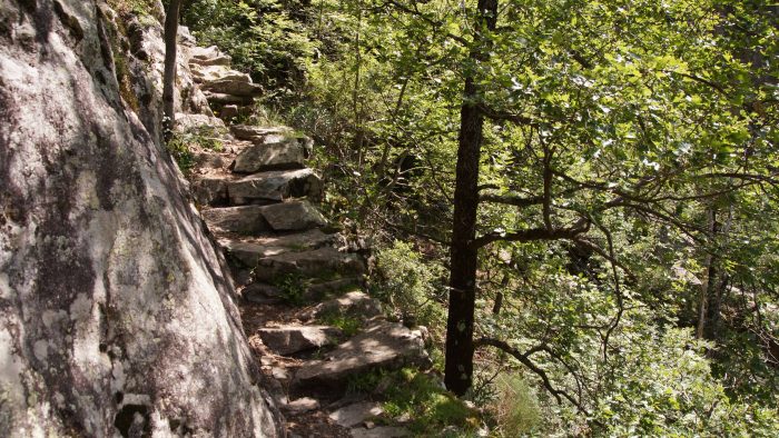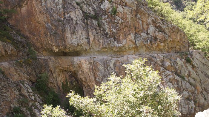 Vom Parkplatz aus ging es durch ein kleines Felsentor in die Schlucht hinein. Zunächst führte uns ein Weg direkt an der La Carança entlang bis hin zu einer Brücke. Unser Weg führte uns am östlichen Ufer unterhalb des Roc de la Madrieu ziemlich steil hinauf. Immer wieder hatten wir atemberaubende Blicke auf die gegenüberliegende Schluchtwand mit dem herausgesprengtem Weg. Unser Weg führte uns ein paar hundert Meter auf steinigem Weg hinauf immer entlang der Schlucht. Teilweise war der Weg ganz schön ausgesetzt.