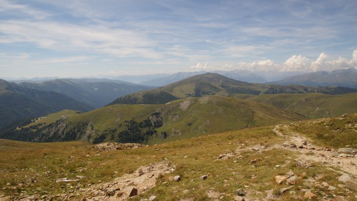 Unser Ziel in den Nockbergen heute war der Parkplatz Eisentalerhöhe auf 2049 m Höhe, was auch der höchste Punkt der Nockalmstraße ist. Von hieraus wollten wir auf den Königstuhl wandern. Unser Auto war schnell auf dem Parkplatz Eisentalerhöhe abgestellt und die Wanderschuhe angezogen. Zunächst ging unser Wanderweg vom Parkplatz aus ostseitig am Gipfel der Eisentalhöhe vorbei. Nach der Überquerung der ersten Kuppe konnten wir bereits fantastische Ausblicke auf die Umgebung der Nockberge mit seinen Almwiesen genießen. Unser Wanderweg schlängelte sich zunächst etwas bergab über die Almwiesen. Nach einem kurzen knackigen Aufstieg ging es zunächst noch einmal etwas hinab in einen kleinen Sattel, worauf der Schlussanstieg zum Königstuhl folgte.