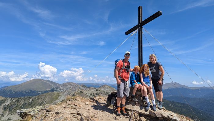 Am Gipfel konnten wir den wunderbaren Ausblick auf die Hohen Tauern im Westen bis zu den Niederen Tauern im Nordosten und zu den Julischen und Karnischen Alpen im Süden genießen.