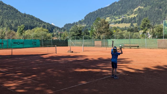 Für heute hatten wir von 11 -13 Uhr Tennisplätze im Tennisclub Patergasse im Tal reserviert. Daher konnten wir erstmal ausschlafen und gemütlich frühstücken. Danach waren die Tennissachen schnell gepackt und um 11 Uhr standen wir auf den zwei Tennisplätzen des Tennisclubs Patergassen. Auf dem einen Feld haben Amelie und Finn gegeneinander gespielt und auf dem anderen Platz Sandra und ich.