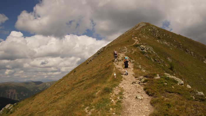 Der Gipfel vom Pfannnock auf 2.254 HM liegt hier schon zum Greifen nahe. Doch bis zum Gipfel war noch etwas an Kondition gefragt. In einem weiten Bogen führte uns ein schmaler Steig zickzackförmig relativ steil zum Grat hinauf, der uns dann in weiterer zunehmenden Steilheit hinauf zum Gipfelkreuz führte.