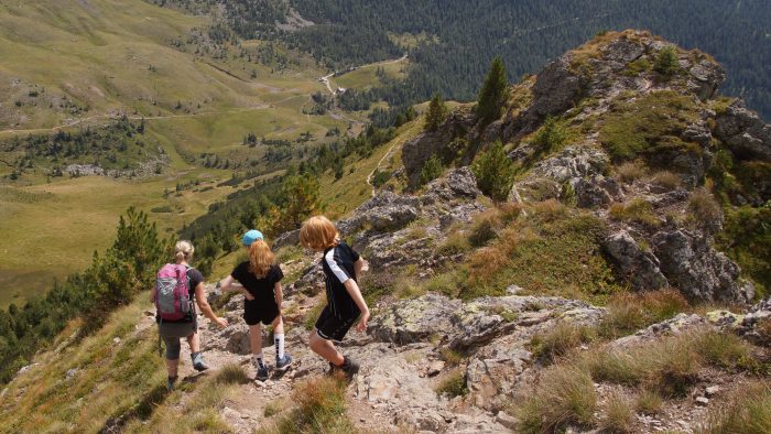 Nachdem wir uns im Gipfelbuch eingetragen hatten, mussten wir aber zunächst den selben Weg am Grat zurücklaufen, allerdings dieses mal direkt weiter auf den kleinen Pfannnock. Das war nur ein kleiner Anstieg. Von hier aus begann dann ein kleines Abenteuer für uns. Der Weg auf der anderen Seite hinab sah zu Beginn noch ganz harmlos aus, wurde von Meter zu Meter aber steiler und felsiger. Immer mehr kleinere Kletterpassagen kam auf uns zu und der Weg wurde immer schmaler. Schlüsselstelle war dann eine etwa 5 Meter Kletterpassage, die ziemlich senkrecht an einer kleinen Felswand mit kleinen Stufen hinab ging. Sicherungsseile – Fehlanzeige.