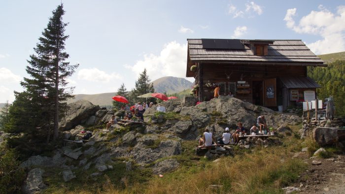 Der Weg ging nun weiter sehr eng und mitunter steil hinab aber bei weitem nicht mehr so krass wie an der Schlüsselstelle. Durch ein sehr dichtes Zirbenwäldchen führte uns der Steig dann auf den normalen Wanderweg in Richtung St. Oswalder Bockhütte. Stolz aber auch ziemlich k.o. von den Anstrengungen des Abstiegs freuten wir uns alle auf die erfrischenden Getränke in der Hütte.