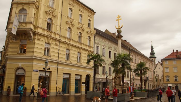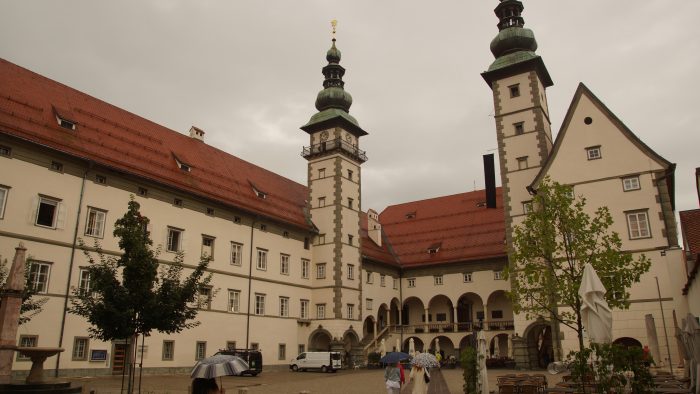 Die Altstadt ist allerdings eine der schönsten in Österreich und lebt besonders durch die vielen jungen Studenten. Klagenfurts Wappen ist der Lindwurm, ein geflügelter Drache, dessen Denkmal auf dem Neuen Platz steht. Als erstes sind wir jedoch im Regen zum Alten Platz gegangen. Barock- und Renaissancebauten säumen die engen Gassen rund um den Alten Platz, auf dem sich das leuchtend gelbe Alte Rathaus aus dem 17. Jahrhundert befindet. Auch die Pestsäule steht hier, die daran erinnert, dass Klagenfurt im Mittelalter von der Pest verschont wurde. In einem netten italienischen Café haben wir uns auf dem.Alten Platz erst Mal ein Eis gegönnt. Da der Regen nicht aufhören wollten, sind wir zum nahe gelegenen Landhaus gegangen.