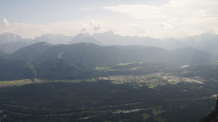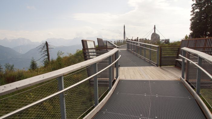 Die spektakulärste Aussichten hatten wir vom Skywalk „Rote Wand“. Die freischwebende Aussichtsplattform, auf die man über einen Steg gelangt, erlaubt einen großartigen Blick 400 Meter über den Abgrund der rötlichen Felswand und eine atemberaubende Fernsicht auf Karawanken und Julische Alpen. Mächtige Felsstürze haben hier zum einmaligen Erscheinungsbild auf der Südseite des Dobratsch geführt.