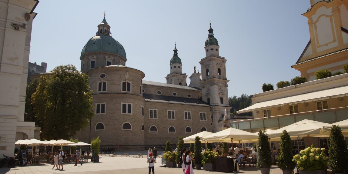 Aufgetankt mit frischer Energie sind wir über den Residenzplatz zum Dom zu Salzburg gegangen. Auf dem Residenzplatz hat besonders Amelie die vielen Pferdekutschen bestaunt. Den Eintritt für den Dom wollten wir nicht zahlen und haben uns nur an der goldenen Kugel auf dem Kapitelplatz bei den vielen Souvenirständen herumgetrieben. Zum Glück wurden Amelie und Finn noch fündig und konnten sich jeweils noch ein Souvenir kaufen.