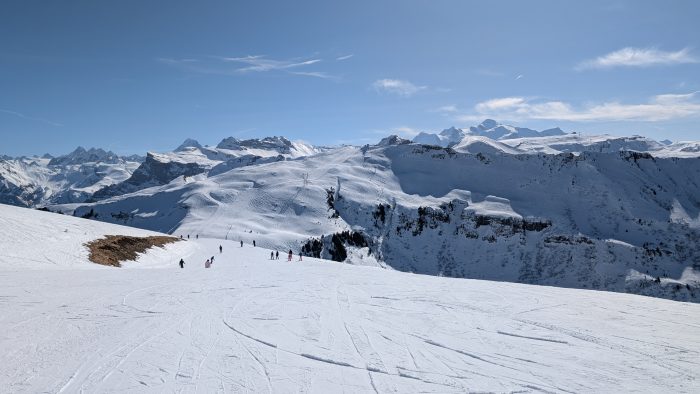 Um 11 Uhr standen Amelie und ich dann auf der Piste und wir suchten gleich wieder den Weg in Richtung Flaine, wo tatsächlich die besten Pisten waren. Allerdings kommen die Pisten von Tag zu Tag in einen schlechteren Zustand – oben hart und vereist; unten sulzig. Wir haben trotzdem das beste aus dem Tag gemacht und sind fast durchgehend die Pisten runtergeheizt.