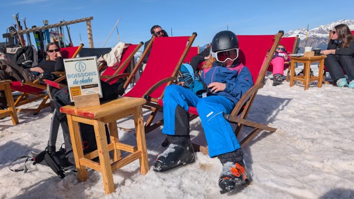 Einmal haben wir eine kleine Pause von 10 Minuten gemacht, um unsere Pausenbrötchen zu essen und etwas zu trinken und natürlich haben wir wieder an unserer Lieblingshütte in den Liegestühlen in der Sonne eine Chocolat Chaud und einen Kaffee getrunken.